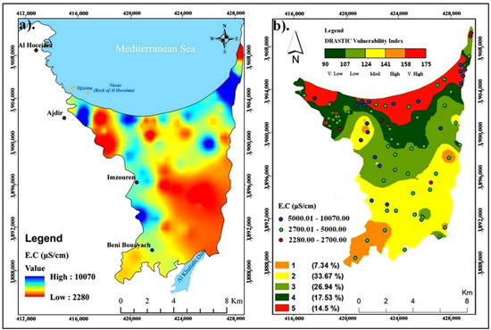 The EC of groundwater samples of the Ghiss Nekkor alluvial aquifer varies from 2280 to 10,070 μS/cm. Furthermore, the high EC values are observed mainly in the northeast and northwest sectors of the aquifer. Thus, the high salt contents are marked in the southwest (Al Khattabi Dam) [58]. Increased EC of groundwater in high-vulnerability areas (Figure 7a) shows groundwater pollution by industrial effluent, which is typically high in TDS [40,60]. Areas with high and extremely high pollution risks (Figure 7b) are frequently observed around agricultural and urban areas. Such a geographical distribution confirmed the result above. For the evaluation of global groundwater quality, the EC of groundwater should not exceed 2700 µS/cm [61]. Hazards in the research area provide signs of a very considerable risk of contamination, primarily from south to north.