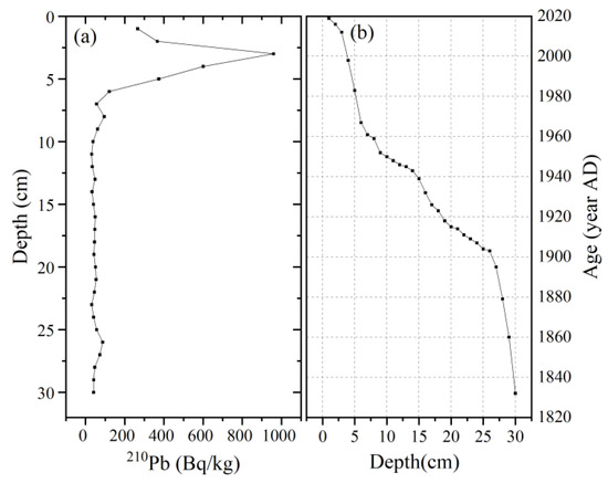 210Pb and 137Cs data were employed to derive core chronologies and related sedimentation rates. Count periods for 210Pb were generally in the interval of 50,000–86,000 s, providing a measurement accuracy between ca. 65% and 610% at the 95% confidence level. The detailed dating method has been described in Reference [32].