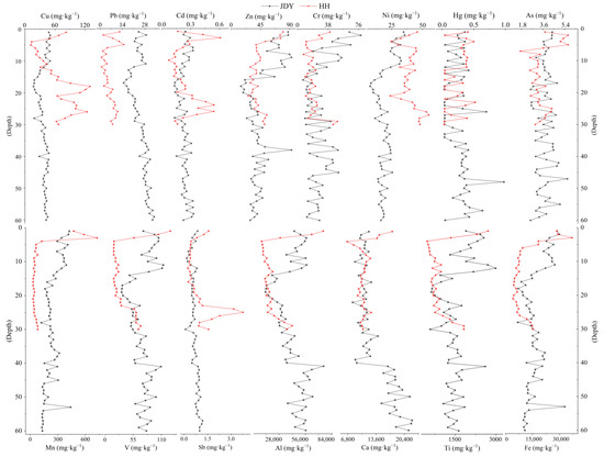 The variations of 15 elements in the peatland of JDY are shown in Figure 3. The mean values of HMs contents from high to low were Al: 41,984 (mg·kg−1) > Fe: 16,449.3 (mg·kg−1) > Ca: 13,311.1 (mg·kg−1) > Ti: 1507.1 (mg·kg−1) > Mn: 237.27 (mg·kg−1) > V: 72.8 (mg·kg−1) > Zn: 46.2 (mg·kg−1) > Cu: 37.6 (mg·kg−1) > Cr: 28.5 (mg·kg−1) > Pb: 25.6 (mg·kg−1) > Ni: 19.6 (mg·kg−1) > As: 3.8 (mg·kg−1) > Sb: 0.67 (mg·kg−1) > Hg: 0.26 (mg·kg−1). The depth profile can be divided into three sections: 1–18-centimeter layer where all HMs exhibited a decreasing trend; 19–47-centimeter layer where all exhibited an increasing trend; and 47–60-centimeter layer showing different trends, i.e., elements of As, Zn, Hg, Al, Cr, Fe, Ti, Mn, and V showed decreasing trends, while Sb, Cu, Pb, Cd, and Ni exhibited increasing trends. Combining the age–depth model, the peatlands sequence can be divided into three stages. Stage I: Before 1959, elements of As, Zn, Hg, Al, Cr, Fe, Ti, Mn, and V exhibited increasing trends, while Sb, Cu, Pb, Cd, and Ni exhibited decreasing trends. Stage II: The elements in each profile showed a decreasing trend during 1960–1998, and the contents of various types of HMs had higher fluctuations before 1989, where the values were smaller and fluctuated less after 1989. Stage III: After 1998, an increasing trend was observed with more erratic fluctuations.