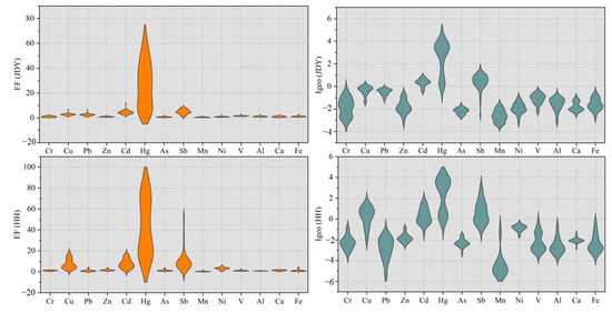 EF < 1 indicates that a metal principally originates from natural origins, while EF > 1 describes anthropogenic contamination: the higher the EF value, the more significant the anthropogenic activities’ contribution.