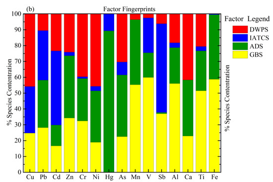 Factor profiles exhibiting the metal concentration percentages acquired from the PMF model via various origins in JDY (a) and HH (b) peatlands. TS represents traffic sources; DWPS: domestic waste pollution source; MIAS: mining industry and agricultural activities; GBS: geological background source; IATCS: industrial-agricultural-transportation complex source; ADS: atmospheric deposition source.
