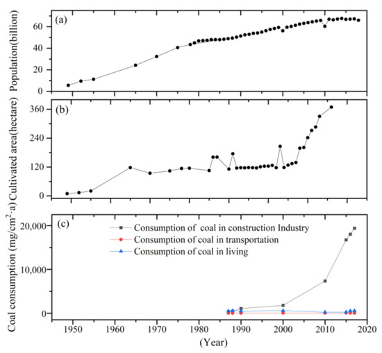 The population (a), cultivated area (b), and coal factors (c) (industry, transportation, and living consumption) of the Altay region.