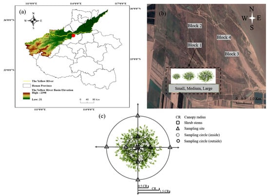 Maps and schematic diagram of the sampling location site in the Yellow River floodplain of Henan Province, China. (a) Color covering area is the Yellow River basin; yellow line is the main channel of Yellow River; red dot is the sample area in the Yellow River floodplain. (b) The map indicates the sample sites in the Yellow River floodplain. (c) The location of the sample site. CR represents the canopy radius. The square is the stem of T. chinensis. The triangle represents the sampling site inside and outside of the canopy. The circle represents the sampling range inside and outside of the canopy.