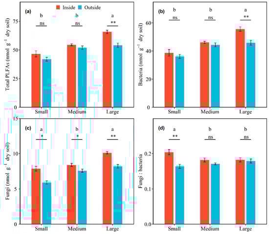 Effects of shrub patch size and sampling location on soil total PLFAs (a), bacterial PLFAs (b), fungal PLFAs (c), and the ratio of fungal to bacterial PLFAs (fungi: bacteria) (d). Shrub patches contain small, medium, and large patches, and sampling locations contain inside-canopy and outside-canopy soil. Note: Different letters above the bars indicate significant differences among the different patch sizes of the microbial community changings between inside and outside of plant canopies at the 0.05 level. Symbols above the bars indicate significant differences of each patch size between the inside and outside of plant canopies (** p < 0.01, * p < 0.05, and ns p > 0.05).