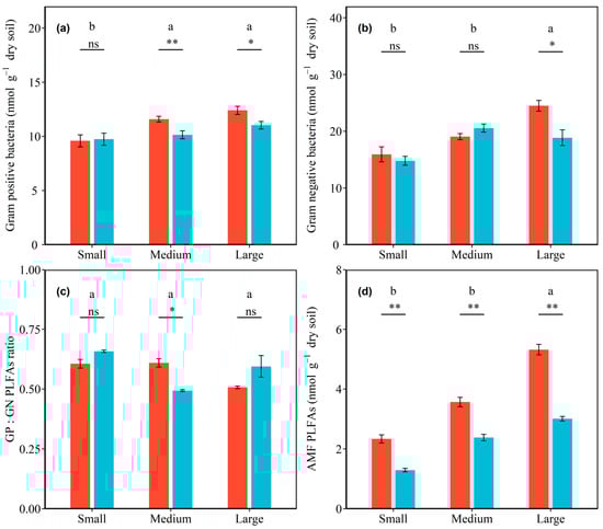 Effects of shrub patch size and sampling location on Gram-positive bacterial PLFAs (a), Gram-negative bacterial PLFAs (b), the ratio of Gram-positive bacterial PLFAs to Gram-negative bacterial PLFAs (c), and arbuscular mycorrhizal fungi (AMF) PLFAs (d). Shrub patches contain small, medium, and large patches, and sampling locations contain inside-canopy and outside-canopy soil. Note: The red and blue bars indicate the microbial PLFAs in inside-canopy and outside-canopy soil under three patch sizes. Different letters indicate significant differences among the different patch sizes of the microbial community changings at the 0.05 level. Symbols above the bars indicate significant differences between the inside and outside of plant canopies of each patch size (** p < 0.01, * p < 0.05, and ns p > 0.05).