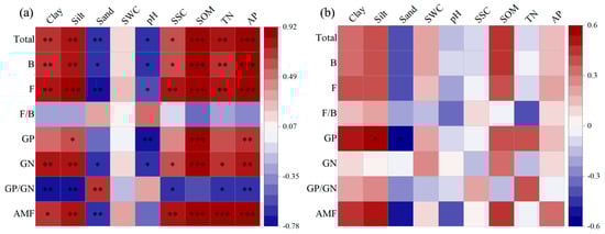 Pearson correlation coefficients between microbial PLFAs and environmental variables inside (a) and outside (b) of shrub canopies under three patch sizes (SWC: soil water content; SSC: soil salt content; SOM: soil organic matter; TN: soil total nitrogen; AP: available phosphorus; Total: total PLFAs; B: bacterial PLFAs; F: fungal PLFAs; F/B: the ratio of fungal PLFAs to bacterial PLFAs; GP: Gram-positive bacterial PLFAs; GN: Gram-negative bacterial PLFAs; GP/GN: the ratio of Gram- positive bacterial PLFAs to Gram-negative bacterial PLFAs; AMF: arbuscular mycorrhizal fungal PLFAs. Red and blue colors indicate positive and negative correlations, respectively; *** p < 0.001, ** p < 0.01, * p < 0.05).