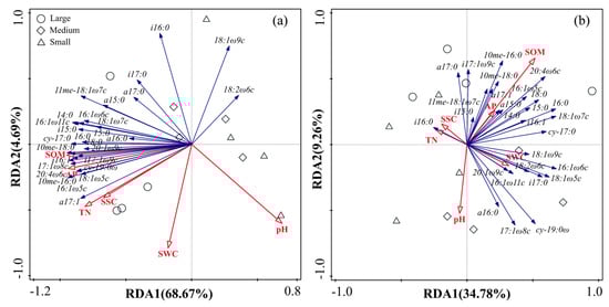 Redundancy analysis (RDA) of soil microbial PLFAs constrained by environmental variables in inside-canopy soil (a) and outside-canopy soil (b) collected from a depth of 0–15 cm under different shrub patch sizes (large, medium, and small indicate large shrub patch size, medium shrub patch size, and small shrub patch size, respectively).
