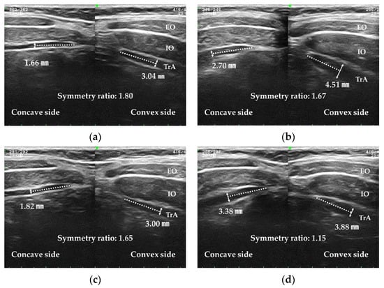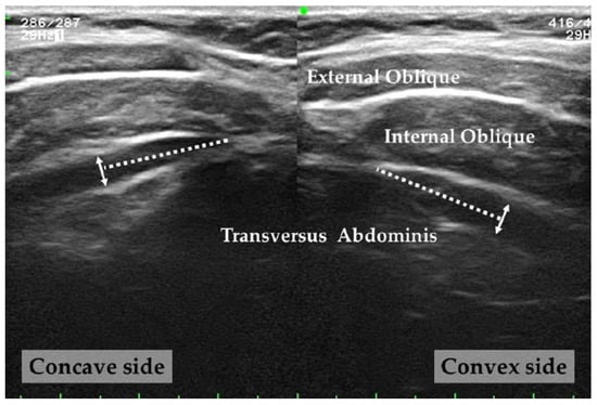 To measure the TrA thickness, the perpendicular distance of the TrA at a site 1.5 cm away from the muscle fascia junction was measured on captured images using Image J (National Institutes of Health, Bethesda, MD, USA) [,,,]. The TrA symmetry ratio was calculated as TrA thickness on the convex side of the lumbar curve/TrA thickness on the concave side of the lumbar curve (Figure 2).