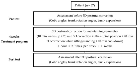 In the warm-up exercise, self-correction was performed while keeping the pelvis stable through a pelvic correction after breathing education []. In the main exercise, load was gradually increased from the supine position to sitting and standing positions. A CC was used according to each curve pattern for 3D alignment in the supine position. The corrected posture was then maintained without CCs in sitting and standing positions, and a mirror was used for visual feedback. Self-elongation, deflection, and de-rotation were performed to align the lumbar curve with the sagittal, frontal, and transverse planes, and then symmetric expansion was induced in the front and back, left and right, and up and down directions while focusing on the concave side of the curve through rotational angular breathing. The corrected posture was maintained as much as possible using isometric tension by slowly breathing during expiration from the expanded posture made through inspiration []. The cool-down exercise phase lasted 10 min, during which the self-corrected posture was maintained while performing a task-oriented exercise, such as a sit-to-stand exercise or walking and standing on an unstable floor. All procedures were conducted with the oversight of a specially trained physiotherapist.