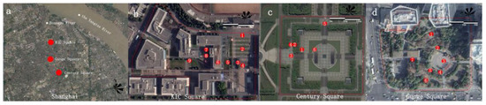 Experiment sites and spots. (a) Shanghai and locations of the three squares: (b) KIC square, (c) Century square, and (d) Guoge square. Numbers in the sub-figures indicates the experiment spots.