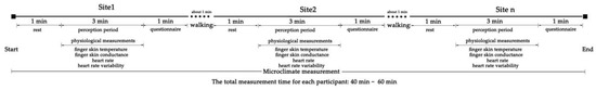 Thirdly, each round of the test included two participants. After preparation, they walked at a uniform pace to the first spot, then rested for 1 min, that has been proved to be suitable in the pretest, to minimize the physiological disturbance by walking. Next, there was a 3 min thermal stress perception period with a standing posture. At the beginning of this period, wireless wearable sensors start to record the physiological signals simultaneously and stop when it ends. After this period, participants needed to fill out the questionnaire in 1 min. Then, participants walked to the next spot and repeated the same process until all the test spots were finished. Each participant takes about 40 min~60 min to finish the entire experiment.