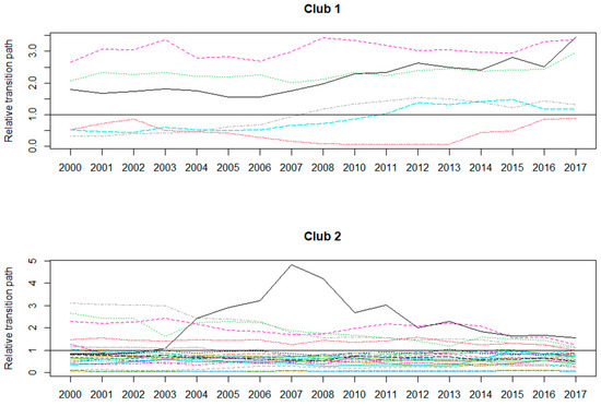 Since China introduced environmental taxes in 2018, which is slightly different from the previous effluent fees, Figure 2 depicts the convergence of ETR at the provincial level between 2000 and 2017. Accordingly, a convergence trend indicates that the variable will be balanced in the long run. Clearly, there are two convergence clubs in terms of China’s ETR, in which club 1 includes Hubei, Jiangsu, Shandong, Inner Mongolia, Jiangxi, and Beijing, while club 2 contains the rest of the 30 sample provinces. This is not consistent with the traditional regional division by the National Bureau of Statistics of China (see Appendix A), where the economic development level of provinces in the eastern region is higher than that in the central region, followed by the western region. Such a result is not similar to Xu et al. (2023) in a case of convergence of fiscal environmental expenditure in China [4], which is mainly due to the different research purposes. Therefore, the convergence results show that future regional collaborative pollution control may also consider convergence-based collaborative policies.