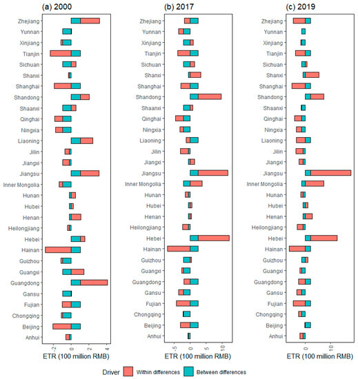 Figure 5 revealed the cause of interprovincial ETR gap from within and between perspectives, and it showed significant regional heterogeneity. The within difference effect is the main cause of the ETR gap for most provinces in terms of the absolute value, including Zhejiang, Tianjin, Shanghai, Liaoning, Jiangsu, Hunan, Henan, Hainan, Guangxi, Guangdong, Beijing, and Anhui. Therefore, in order to balance the overall uneven pattern of ETR distribution, policymakers should focus on narrowing the differences of ETR within the region. However, for different regions, the direction of the effect of within difference is not the same. For example, except for Beijing and Shanghai in the eastern region, the within difference effect plays a promoting role in widening the ETR gap. Beijing and Shanghai are different from other provinces in the eastern region, probably because they have received better policy support and clean energy development, which is more conducive to reducing pollution [19]. For provinces such as Qinghai, Ningxia, Inner Mongolia, and other provinces in the western region, the within difference effect has an inhibitory effect on widening the ETR gap. In 2017 and 2019, the influence direction of within difference effect and between difference effect on ETR gap did not change significantly compared with 2000, which is similar to the findings by the study in a case of CO2 emission [14]. To sum up, given that the driver pattern based on within and between perspectives has not changed significantly, the within regional differences should be fully considered in future environmental tax policy reform.