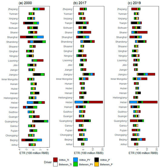 Figure 6 further revealed what factors within and between regions contributed to the formation of ETR gap by combining the two spatial decomposition perspectives above. In 2000, the within TI difference effect, the between population difference effect, the within GDP per capita difference effect, and the between GDP per capita difference effect were the main causes of the overall ETR gap, while the between population difference effect and the between TI difference effect had very little impact on the ETR gap. Further, the influence of various drivers on the ETR gap is heterogeneous in different regions and within regions. For example, the within TI difference effect suppresses the ETR gap between eastern provinces, such as Shandong, Shanghai, Tianjin, and Beijing, and the benchmark provinces, while it promotes the ETR gap between eastern provinces, such as Zhejiang, Liaoning, Hebei, and the benchmark provinces. In comparison with a previous study [5], such results imply more information on the within and between difference of ETR in the country.