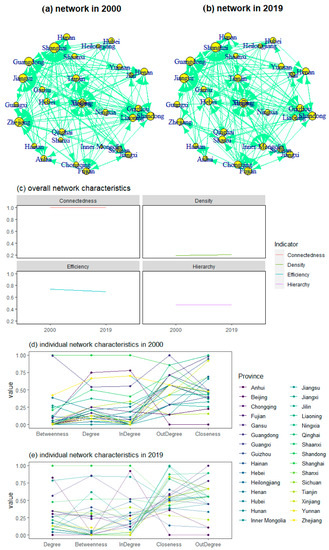 Figure 7a,b depicted the interprovincial ETR network in China between 2000 and 2019, implying the complex structure of internal connections. In terms of the overall network characteristics, the overall network density of provincial ETR spatial correlation exhibited a slight increasing trend, increasing from 0.1931 in 2000 to 0.2092 in 2019, suggesting the spatial correlation between provinces in China was getting closer in terms of ETR. The overall network connectedness indicated that provincial ETR exhibited significant spillover effects due to the unchanged value of network connectedness. Figure 7c further indicated that the interprovincial ETR network hierarchy presented a slight decreasing trend, changing from 0.4737 in 2000 to 0.4725 in 2019. The finding implied that the interprovincial correlation and interaction of ETR has thus been gradually strengthened after breaking the spatial correlation structure of ETR, which is similar to the study focusing on carbon intensity [19].