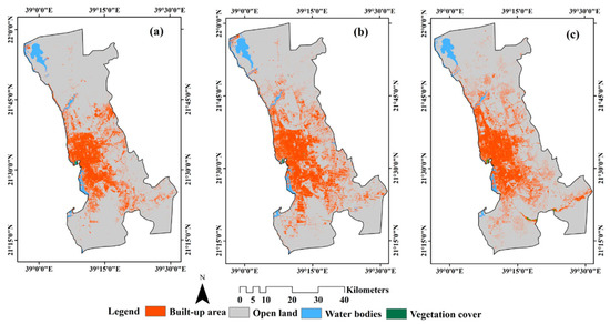 Land use and land cover (LULC) in Jeddah: (a) 2000, (b) 2010, and (c) 2021.