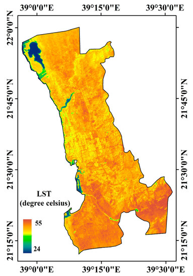 Thus, based on the overall results, we determined that most of the areas in Jeddah megacity are characterized by very high LST. Moreover, urban green infrastructure can decrease LST, based on the very poor positive correlation with NDVI. These analyses suggest the protective implications of green infrastructure strategies that are needed to mitigate increased LST in Jeddah megacity. In many developed and developing countries, the implications of urban green infrastructures have been largely promoted to mitigate heat in urban areas. Urban green infrastructure planning strategies have been prioritized in particular, for example in Copenhagen [70], Nanjing [88], and Berlin [89]. Thus, green infrastructures can be a very effective measure to mitigate heat. In Saudi Arabia, the Ministry of Municipal and Rural Affairs (MoMRA) has adopted a number of strategies to improve green spaces in cities. The MoMRA has invested huge financial support in the sustainable planning of green spaces in Saudi Arabia. Therefore, green spaces at the city as well as neighborhood scale need to be planned and designed properly.