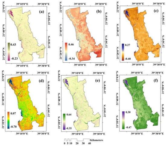 The distribution of biophysical indices in Jeddah (2021): (a) NDVI, (b) NDBI, (c) NDWI, (d) NDBaI, (e) SAVI, and (f) MNDWI (2021).