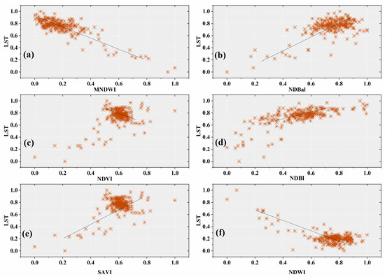 The biophysical indices have a significant impact on the LST [44]. In this study, the correlation between LST and biophysical indices was determined using Spearman’s correlation coefficient (r) (Table 4). The correlation results showed that LST has a positive relationship with NDBI (r = 0.665) and NDBaI (r = 0.367), and a very weak positive relationship with NDVI and SAVI. On the other hand, MNDWI and NDWI have a negative relationship with LST (Figure 5). This result clearly indicates that the areas with higher water coverage are characterized by lower LST. These findings agree well with previous literature.