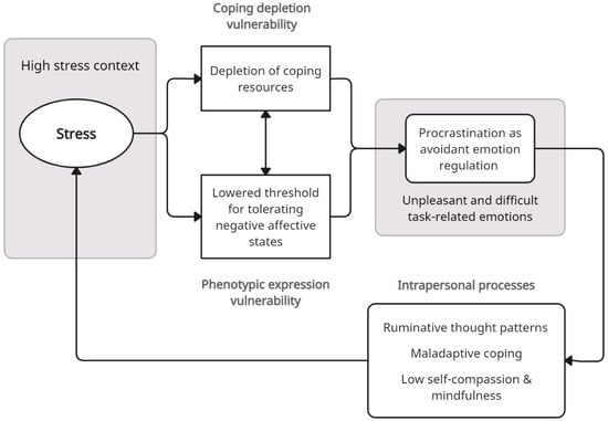 Stress context vulnerability model of procrastination. Note: High-stress contexts are proposed to increase vulnerability for procrastination via depletion of coping resources and lowering tolerance for negative states. Procrastination is used as an avoidant coping strategy to manage negative task-related emotions, and subsequently generates further stress through intrapersonal appraisal processes, thereby amplifying contextual stress in a cyclic and dynamic manner.
