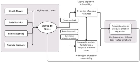 Psychosocial stressors, such as those that were prominent during the COVID-19 pandemic, can also create a backdrop of heightened stress that may increase coping depletion and/or phenotypic vulnerability for procrastination for some individuals. For example, employment and financial insecurity are well-known sources of chronic stress [,]. Similarly, social isolation and loneliness are societal challenges that can create ongoing background stress [,,] that may weaken emotion regulation capacities as well as reduce perceived social coping resources.