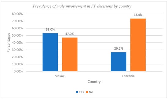 Men are frequently regarded as the primary decision-makers regarding family size and the use of FP, and therefore, there is an urgent need to increase FP uptake in Malawi and Tanzania. Several studies in high- and middle-income countries have identified a strong association between male involvement and an upsurge in contraceptive uptake and use [,]. Men who permit shared spousal decisions must be included if the reproductive health indicators are to be met. One of the factors contributing to the high rates of maternal illness and mortality is the low degree of male participation in reproductive health practices. This has decreased the effects of FP interventions and coupled with uncontrolled fertility, which impedes economic growth and throws a nation’s politics into instability [,]. Studies on FP have found that male involvement is positively correlated with access to the media, including television and radio, spouse employment status, and average monthly income [,]. Despite this, there are conflicting results regarding the level of male involvement in FP decisions and the factors that influence this involvement in Malawi and Tanzania. As a result, there is a dearth of information regarding the factors that influence male involvement in FP services in these countries. In order to help policymakers build FP programs that will promote male involvement in FP choices, data must be generated. Therefore, the purpose of this study was to determine the point prevalence of male involvement in FP decisions in Malawi and Tanzania, as well as the factors that influence this involvement. Additionally, this study seeks to contribute to the body of knowledge by exploring male involvement in FP decisions within the household context, using the demographic health surveys.