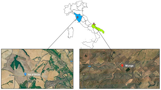 The study analyzed two wheat husk (WH) samples of the ancient “Senatore Cappelli” (SC) cultivar from two different wheat production chains. The first SC cultivar was located in the hilly territory of Val d’Orcia (WH1) in the Tuscany region, while the WH2 samples were cultivated on the karstic Murge upland, which is located in the Puglia region, as shown in Figure 1. In particular, owing to the peculiar pedo-climatic characteristics of these areas (mild climate, distributed rainfall throughout the year), the soil is characterized by a high percentage of loam and clay and a lower percentage of sand; it is also flat and has good drainage. Both samples were cultivated from October 2021 to June 2022. Approximately 200 g of each SC durum wheat husk was previously ground finely using a blender and then sieved using a sieve with 0.7 to 2.0 mm diameter holes. The obtained particle size fractions were collected and stored at refrigerated temperature, namely T = −18 °C, until the day of analysis. Raw matrices WH1 and WH2 had a moisture content of 6% when analyzed.