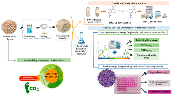 Both raw matrices and hydroalcoholic wheat husk extracts were characterized by HPLC chemical, spectrophotometric, anti-inflammatory, and cytotoxicity analysis, as shown in Figure 2.