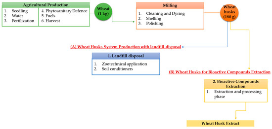 System Boundary of Durum Wheat Production considering (A) wheat husks for landfill disposal and (B) wheat husks for bioactive compounds extraction.