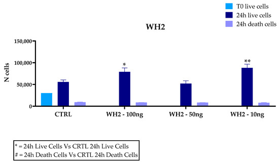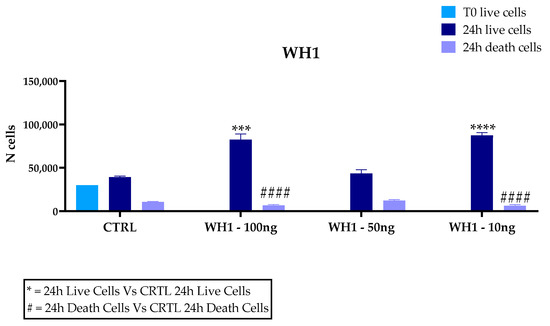 An increase in dead cells was observed in WH1 compared to controls, although there was an increase in cell number. At 50 ng/mL concentration, no significant differences with untreated cells were recorded in both WH1 and WH2.