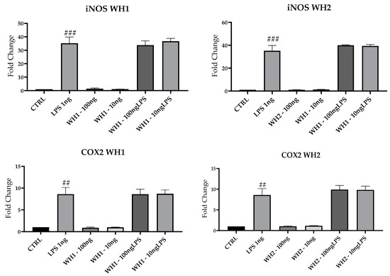 Pretreatment with husk-derived extracts from both strands (WH1 and WH2) did not modulate iNOS, COX2, and CCL2 mRNAs expression. Husk extracts are devoid of any pro-inflammatory activity because they do not increase the expression of M1 markers.