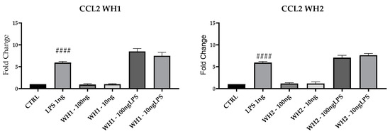 To evaluate the possible pro-inflammatory effect of the chaff-derived extracts of the two aforementioned dies, we analyzed the mRNAs of key M1 markers in BV2 cells. Results for mRNA expression of iNOS, COX2 and CCL2 mRNAs, and M1 markers highlighted a significant increase following LPS treatment compared with untreated cells (CTRL) (Figure 5).