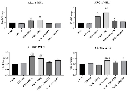 Expression of ARG-1 mRNA was induced by the addition of extracts obtained from WH1 and WH2 husk at both 100 and 10 ng/mL concentrations and compared with CTRL. Pretreatment with 10 ng/mL of WH2 husk extracts significantly increased ARG-1 mRNA expression also after the addition of LPS. The mRNA expression of CD206 increased significantly compared with CTRL after addition of WH1 100 and 10 ng/mL and WH2 10 ng/mL. In both chains, ARG-1 expression increased in cells pretreated with the extracts obtained from Pula in the presence of LPS.