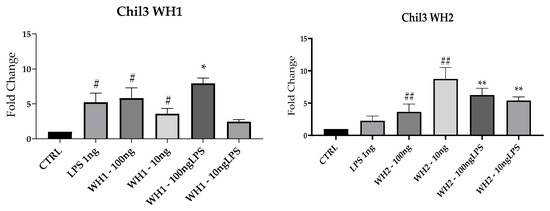 Chil3 mRNA expression was induced by the extracts alone in both chains. In the presence of LPS, the WH2 extracts at the concentrations of 100 and 10 ng/mL and WH1 extracts at the concentration of 100 ng/mL stimulated Chil3 mRNA expression.