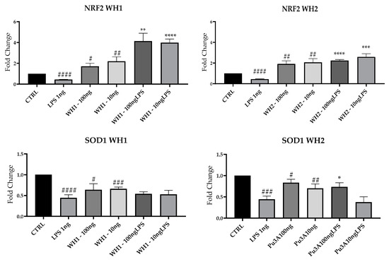 NRF2 and SOD1 mRNAs were evaluated by qRT-PCR. Data are shown as mean ± SD from three independent experiments performed in triplicate. Expression profiles were determined using the 2−ΔΔCT method. # VS CTRL; * VS LPS; * p < 0.05; ** p < 0.01; *** p < 0.001; **** p < 0.0001; # p < 0.05; ## p < 0.01; ### p < 0.001; #### p < 0.0001.