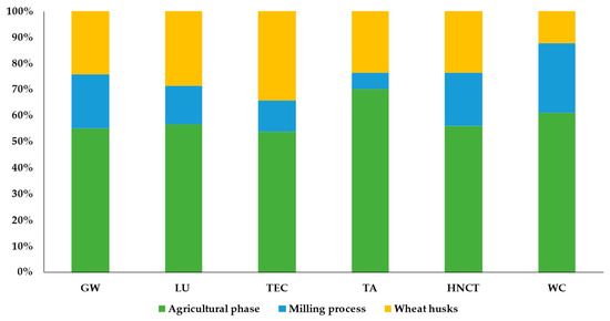 Percentage contribution (%) of each wheat process life cycle stage to environmental impact categories. GW, global warming; LU, land use; TEC, terrestrial ecotoxicity; TA, terrestrial acidification; HNCT, human non-carcinogenic toxicity; WC, water consumption.