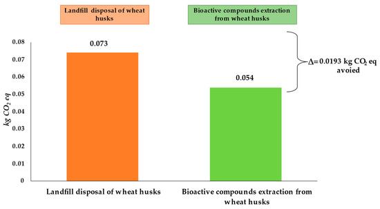 In these regards, evaluating the potential CO2 emissions associated with the landfill disposal of 180 g of husk (obtained from the milling process of 1 kg of wheat), which is commonly used for animal breeding or soil conditioning purposes [10], it can be seen that it generates 0.073 kg CO2 eq, corresponding to 19.8%, of the total emissions generated. In the case of recycling this by-product for the extraction of high-value-added bioactive compounds, about 0.054 kg CO2 eq would be generated, accounting for about 14.5% of the total GHGs. Therefore, considering the possible valorization of the husk as an alternative to landfill disposal results in an avoided CO2 amount of 0.0193 kg CO2 eq, as shown in Figure 9. Different studies in the literature focused on applications possibilities for wheat milling by-products, thus focusing on their recycling processes for renewable energy production [7,44,49], biofuel and bio-gasification processes [9], as well as for the production of feedstock to produce various products including biosurfactants [50].