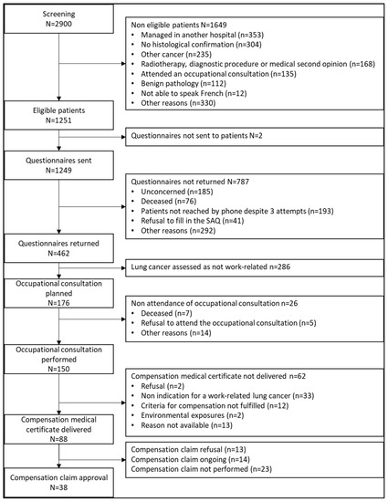 - Pérol, O.; Charbotel, B.; Perrier, L.; Bonnand, S.; Belladame, E.; Avrillon, V.; Rebattu, P.; Gomez, F.; Lauridant, G.; Pérol, M.; et al. Systematic Screening for Occupational Exposures in Lung Cancer Patients: A Prospective French Cohort. Int. J. Environ. Res. Public Health 2018, 15, 65. [Google Scholar] [CrossRef] [PubMed]