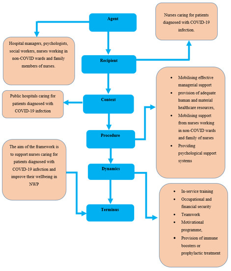 This is the sixth and last concept on the survey list of Dickoff et al. (1968) [5]. Terminus, in this context, refers to the endpoint or the outcome of the newly developed conceptual framework. The endpoint or the aim of the newly developed framework discussed here is to support the nurses caring for patients diagnosed with COVID-19 infection in NWP. The conceptual framework will enable nurses to develop effective coping skills. The implementation of the developed conceptual framework should be supported by all agents.