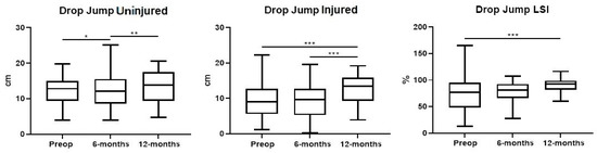 Drop jump for the healthy knee showed improvements at the 12-month evaluation compared to the 6-month evaluation (p < 0.01), but not between the 6-month follow-up and the baseline (p = n.s.). Drop jump for the injured knee showed improvements at the 12-month evaluation compared to the baseline (p < 0.001) and the 6-month follow-up (p < 0.001). No differences were observed between the 6-month evaluation and the baseline. Drop jump LSI showed improvements at the 12-month evaluation compared to the baseline (p < 0.001), with the mean value improving from 76.6% (SD: 32,4) to 90.2% (SD: 14.7; p < 0.001) at follow-up. No differences were observed between the 6-month evaluation and the baseline, or between the 6- and 12-month evaluations (p = n.s.) (Figure 1).