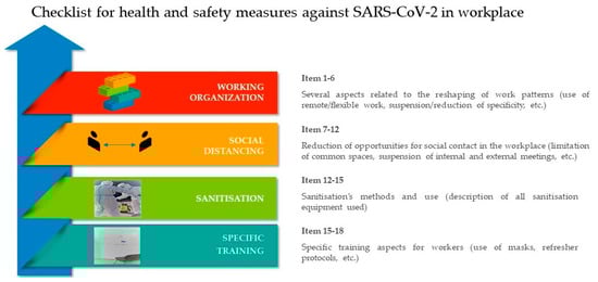 The 18-item adopted questionnaire (Appendix A) was drafted on the basis of Regulatory COVID-19 Protocol developed by the Italian State’s government, considering the topics identified by the Italian Legislation and Ministerial Scientific-Technical Committee, aimed at the containment of viral spread []. The questionnaire was drawn up to investigate how companies complied with the law in responding to the pandemic emergency as a memorandum to stakeholders regarding regulatory dictates. The checklist items were grouped into four macro-areas, as shown in Figure 1.