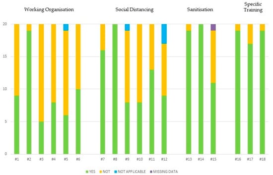 Furthermore, when analyzing the fulfilment of the ‘notes’ section, only 104 answers out of a total of 360 were provided. The most frequent comment concerned item #15, where 70% of the companies were mainly concerned about the products used for sanitization. The other comments were mainly found for work organization and social distancing, which were used to justify the high rate of negative answers.