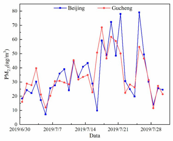 Daily average PM2.5 concentrations in Beijing and Gucheng during the sampling period.