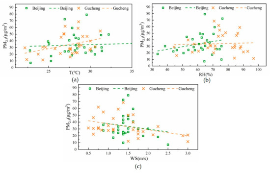 Correlations between the meteorological parameters and PM2.5 concentrations at the two sampling sites ((a), (b), and (c) correlate with T, RH, WS and PM2.5, respectively, the green symbols denote Beijing, and the orange symbols denote Gucheng).