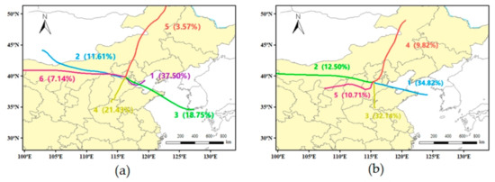PM2.5 concentrations are influenced not only by local sources but also by regional transport. Data obtained from the Beijing Municipal Bureau of Ecology and Environment, covering the third round of PM2.5 source analysis in Beijing, indicated that regional transmission accounts for approximately 40% of the total concentration [31]. The trajectory clustering results are shown in Figure 5. Six clustering trajectories were obtained in Beijing (a), and five clustering trajectories were obtained in Gucheng (b).