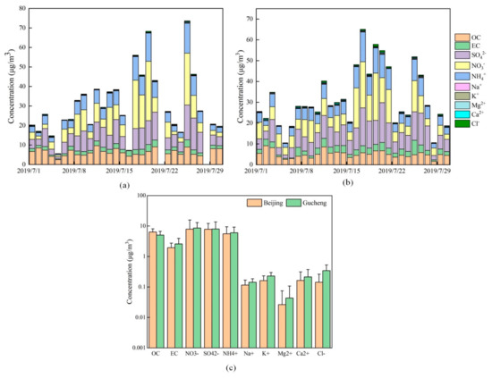 Carbonaceous fraction and water-soluble ion concentrations in Beijing and Gucheng ((a,b) are the accumulation maps of water-soluble ion concentrations in Beijing and Gucheng, respectively, and (c) is the concentrations of water-soluble ions in the two places).