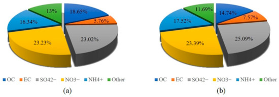 OC and EC are important components of PM2.5. Most of the EC comes from the inadequate combustion of carbon-containing fuels. OC comes from direct emissions of primary OC and secondary OC generated by photochemical reactions [32]. The average concentrations of OC and EC in Beijing PM2.5 are 6.34 and 1.96 μg/m3, respectively. As shown in Figure 7, OC and EC account for 18.67% and 5.76% of the total PM2.5 concentration in Beijing, respectively. However, OC and EC accounted for 14.74% and 7.58% in Gucheng, respectively. A previous study showed that the main contributor to the OC and EC concentrations in Beijing was gasoline vehicles [33,34]. The differences in the OC and EC percentages between the two sites may originate from their different sources of PM2.5. The higher EC percentage in Gucheng was from the inadequate combustion of industrial coal emissions.