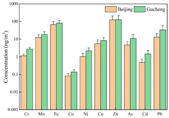Figure 8 shows the concentrations of the water-soluble elements at the two sites. As shown in Figure 8, most element concentrations were slightly higher in Gucheng than in Beijing. The data statistics showed that the elements with higher concentrations in PM2.5 at both sites were Zn, Fe, Pb, and Mn. This occurred because these polluting elements are mainly influenced by the surrounding production and living processes. The Zn contents in Beijing and Hebei were the highest. According to the study, Zn pollution was mainly attributed to the wear of motor vehicle tires and brake pads. The average concentrations of these metal elements in Beijing were 124.96, 66.97, 13.06 and 12.55 ng/m3, respectively. In Gucheng, the concentrations were higher than those in Beijing, at 127.25, 81.96, 33.65 and 18.72 ng/m3, respectively. The Cu, As, Ni, Cr, Cd and Co concentrations were relatively low. The concentrations of these elements in Beijing were 5.52, 4.72, 1.02, 1.14, 0.48, and 0.08 ng/m3, respectively, and in Gucheng, the concentrations of these elements were 8.30, 10.84, 2.19, 2.79, 1.44, and 0.14 ng/m3, respectively. This may be due to the higher industrial activity around Gucheng.