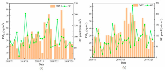Time series of the OP values and PM2.5 concentration in Beijing (a) and Gucheng (b).