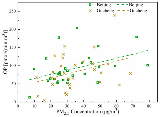 The relationships between the chemical components and the OP of PM2.5 in Beijing and Gucheng are very different. This mainly occurs because the PM2.5 sources are different between the two regions, and the contributions of each component to the PM2.5 concentrations are different, resulting in different contributions to the production of OP. The OP of PM2.5 in Beijing is mainly affected by vehicle exhaust, while that in Gucheng is also affected by dust and combustion sources, such as industrial coal burning and biomass burning.